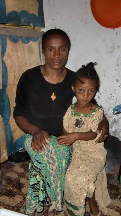 Mesfen hat Mutter Zenash (geb. 25.07.1982) mit ihrem Kind (geb. 10.11.2007) in einer verzweifelten Lage angetroffen. Beide lebten unter einer Plastikplane im Dreck am Straßenrand. Zenash ist HIV positiv, aber Mehret Gott sei Dank nicht. Der Vater hat Mutter und Kind vor zwei Jahren verlassen. Mittlerweile haben sie ein schützendes Dach über dem Kopf und die Mutter wird medizinisch versorgt. Wir haben beide schwer erkältet angetroffen, denn die Nächte sind in Addis auf ca. 2300 m Höhe sehr kalt. Aus meinem mitgebrachten Fundus haben wir Mutter und Kind sofort mit warmer Kleidung versorgt. Am Tag darauf wurde eine große Wolldecke beschafft. Die Mutter hat die Schule nach der vierten Klasse verlassen müssen. Mehret hat nun eine echte Chance. Wir haben Zenash vor einigen Monaten einen kleinen Holztisch und Gemüse finanziert. Damit hat sie sehr geschickt ein kleines Geschäft aufgebaut und kann nun mit ihren eigenen Händen auch einen Teil zur Versorgung ihrer Tochter beitragen. Mittlerweile verkauft sie Holzkohle, getrockneten Kuhdung (als Brennstoff), Tomaten, Chili und Zwiebeln.